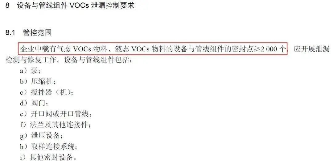 即對于企業(yè)中載有氣態(tài)VOCs物料、液態(tài)VOCs物料的設(shè)備與管線組件密封點(diǎn)小于2000個的,不強(qiáng)制開展泄露檢測與修復(fù)工作。