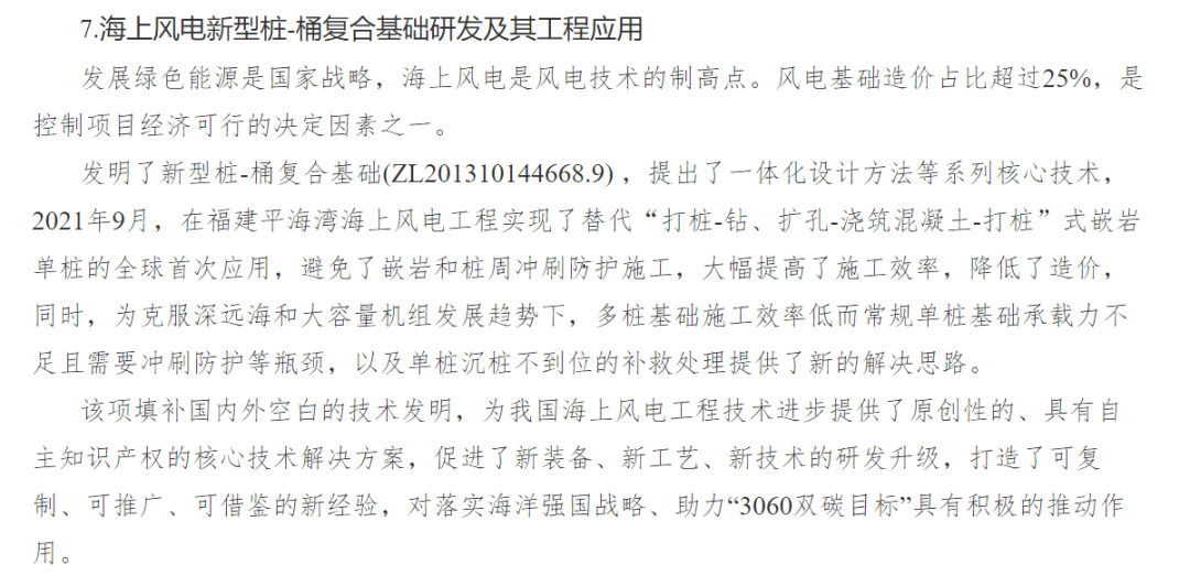 日前,華東院海上風(fēng)電“新型樁-桶復(fù)合基礎(chǔ)研發(fā)及其工程應(yīng)用”入選2021年度中國十大海洋科技進(jìn)展。這項(xiàng)由華東院發(fā)明并創(chuàng)新設(shè)計的核心技術(shù),不僅大幅提高了海上施工作業(yè)效率,也為破解海上風(fēng)電走向深遠(yuǎn)海、大機(jī)組過程中常規(guī)單樁基礎(chǔ)承載力不足等難題,提供可復(fù)制、可推廣、可借鑒的經(jīng)驗(yàn)與思路,為國家海洋技術(shù)領(lǐng)域發(fā)展、助力“3060雙碳目標(biāo)”,發(fā)揮積極作用。