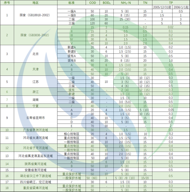 在現(xiàn)行《城鎮(zhèn)污水處理廠污染物排放標準》(GB 18918-2002)和《地表水環(huán)境質(zhì)量標準》(GB3838-2002)的基礎(chǔ)上,北京、天津、江蘇、浙江、湖南、寧夏、云南昆明、廣州茅洲河流域、河北大清河流域、河北子牙河流域、河北黑龍港及運動流域、陜西黃河流域、安徽淮河流域、湖北漢江中下游、四川岷江沱江流域以及重慶梁灘河流域等陸續(xù)發(fā)布地方城鎮(zhèn)污水/流域污水相關(guān)排放標準。中國水網(wǎng)對上述各省、市城鎮(zhèn)污水及流域水污染物排放標準中COD、BOD5、NH3-N、TN以及TP共十八個標準五項指標加以整理匯總并對比,如有疏漏,歡迎留言補充!