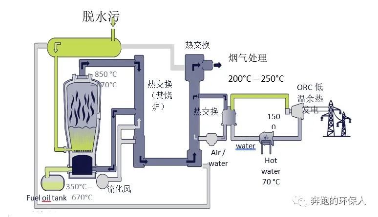 處理流程包括:流化床焚燒爐——一級換熱器(用于加熱余熱流化風、余熱鍋爐產(chǎn)生蒸汽)——二級預熱器(用于煙氣控制、飛灰處理、輔助系統(tǒng)、發(fā)電裝置等)——煙氣處理系統(tǒng)。