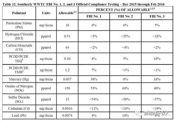改造完成后,官方于2015年底至2016年出進行了為期三個月的尾氣測試,最終結果顯示,經(jīng)過改造后,Southerly污泥焚燒廠的尾氣排放值完全滿足新標準中關于“已建流化床焚燒爐”尾氣排放的要求。下表數(shù)據(jù)中的百分數(shù),表示實測濃度與排放限值的比例。