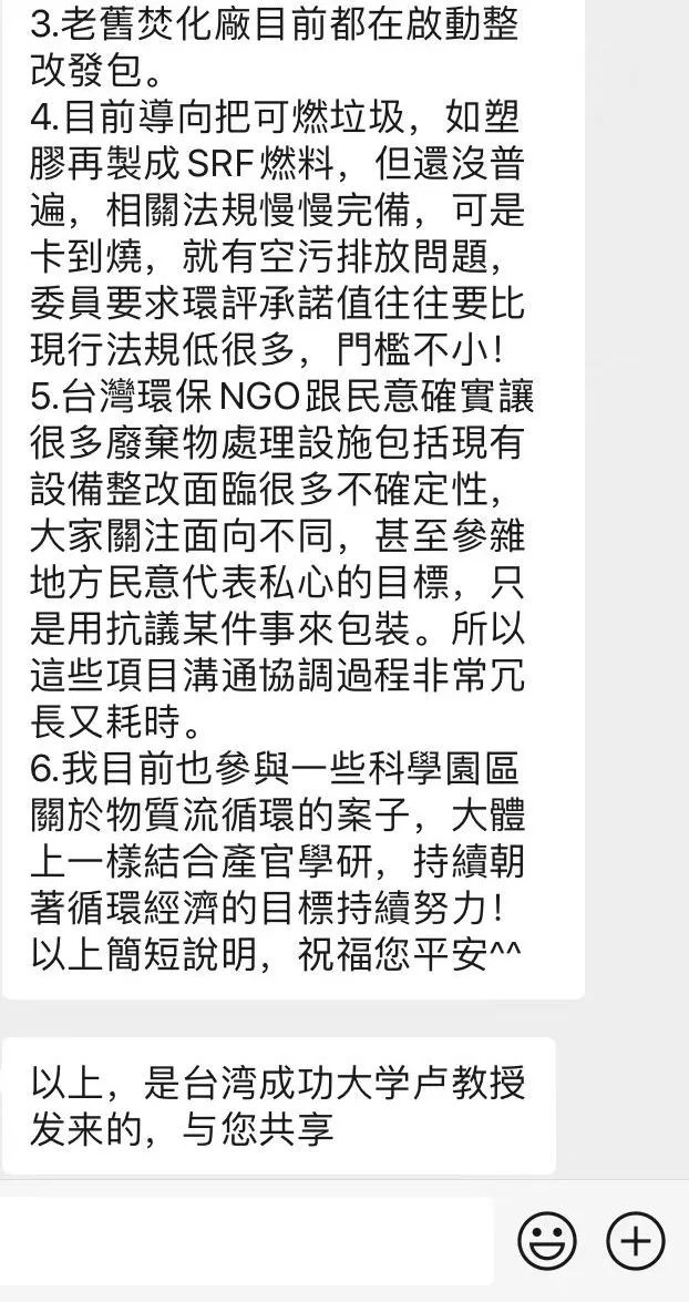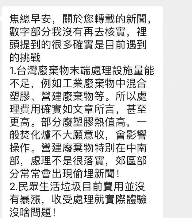 清氣團(tuán)在發(fā)布了相關(guān)臺(tái)灣垃圾分類處置研究的文章后,也獲得臺(tái)灣當(dāng)?shù)毓虖U同行的注意,并通過國(guó)內(nèi)某熱心同行老總,輾轉(zhuǎn)傳來相關(guān)回應(yīng)。