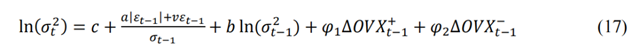 進(jìn)一步檢驗(yàn)OVX的非對(duì)稱作用,即區(qū)分OVX上升和下降兩種情況并分別生成變量,同時(shí)納入原EGARCH模型中,比較兩變量的系數(shù)。模型見式(17),結(jié)果如圖6所示,原油市場波動(dòng)增加對(duì)EUA市場波動(dòng)影響更大。