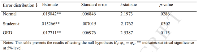最后作者運(yùn)用預(yù)測包容檢驗(yàn)證明了將OVX加入標(biāo)準(zhǔn)EGARCH模型確實(shí)增加了有效信息,能改善模型對(duì)EUA市場波動(dòng)的預(yù)測表現(xiàn)。