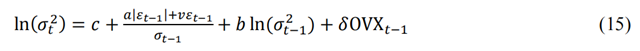 使用EGARCH模型考察原油市場波動(dòng)對(duì)EUA市場影響時(shí),發(fā)現(xiàn)在正態(tài)分布、t分布、GED分布三種假設(shè)下,OVX的系數(shù)全部顯著為正,表示原油價(jià)格波動(dòng)的上升會(huì)導(dǎo)致EUA市場波動(dòng)的增加,引起排放價(jià)格下降。