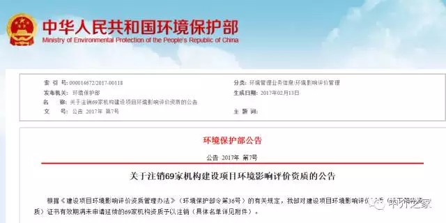 關(guān)于注銷69家機構(gòu)建設(shè)項目環(huán)境影響評價資質(zhì)的公告