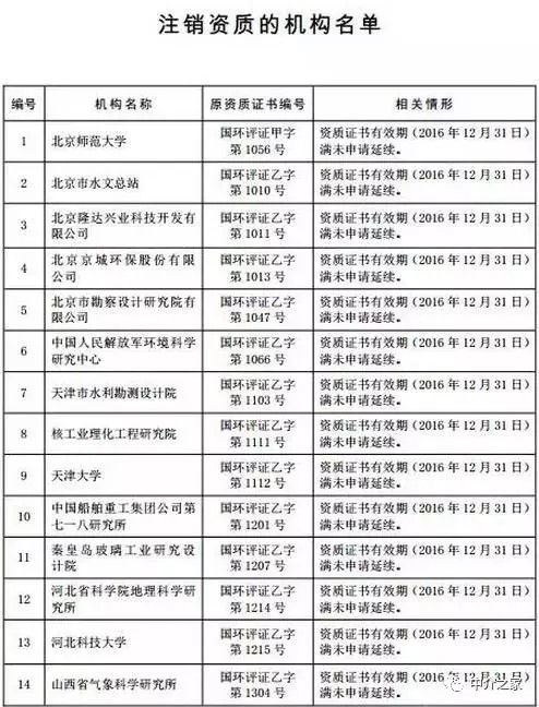 這次被注銷環(huán)評資質(zhì)的機構(gòu)包括:北京師范大學、天津大學、上海大學、上海師范大學、華東理工大學、華中科技大學、武漢大學、西南交通大學等國內(nèi)著名高等院校,以及十多家較有實力的研究院所,具體名單詳見附件。