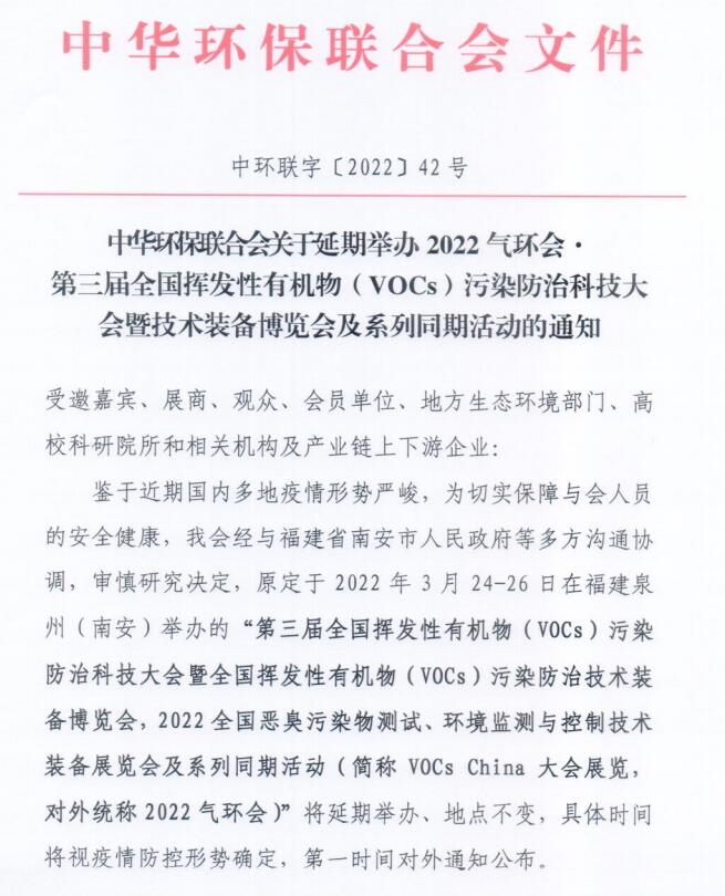中華環(huán)保聯(lián)合會(huì)關(guān)于延期舉辦2022氣環(huán)會(huì)●第三屆全國揮發(fā)性有機(jī)物( VOCs )污染防治科技大會(huì)暨技術(shù)裝備博覽會(huì)及系列同期活動(dòng)的通知