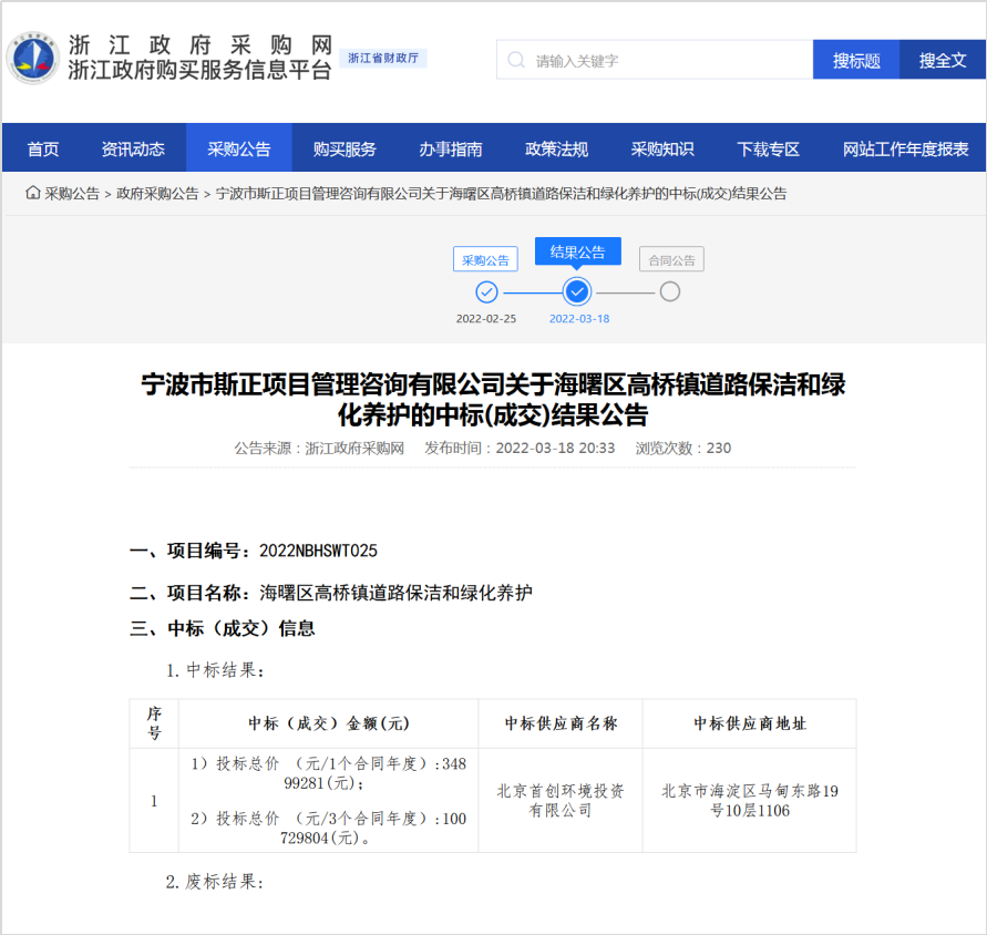 3月18日,浙江政府采購網(wǎng)發(fā)布寧波市海曙區(qū)高橋鎮(zhèn)道路保潔和綠化養(yǎng)護(hù)項(xiàng)目中標(biāo)公告,北京首創(chuàng)環(huán)境投資有限公司以10072.9804萬元/3年的投標(biāo)價(jià)格中標(biāo)該項(xiàng)目。 近日,首創(chuàng)環(huán)境在環(huán)衛(wèi)市場連下兩城,中標(biāo)金額約1.6億元。