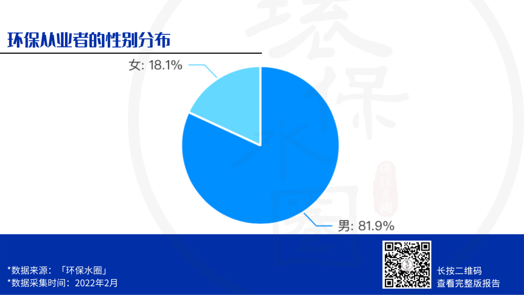 本次調(diào)查發(fā)現(xiàn),環(huán)保從業(yè)群體中男女比例為81.9%:18.1%,接近5:1,與我們?cè)?021年調(diào)查的結(jié)果相比,女性環(huán)保從業(yè)者的比例提升了1.5%~2%,這是一個(gè)非??上驳默F(xiàn)象,希望越來(lái)越多的小仙女兒們能加入環(huán)保的隊(duì)伍中來(lái),男女搭配,干活不累!