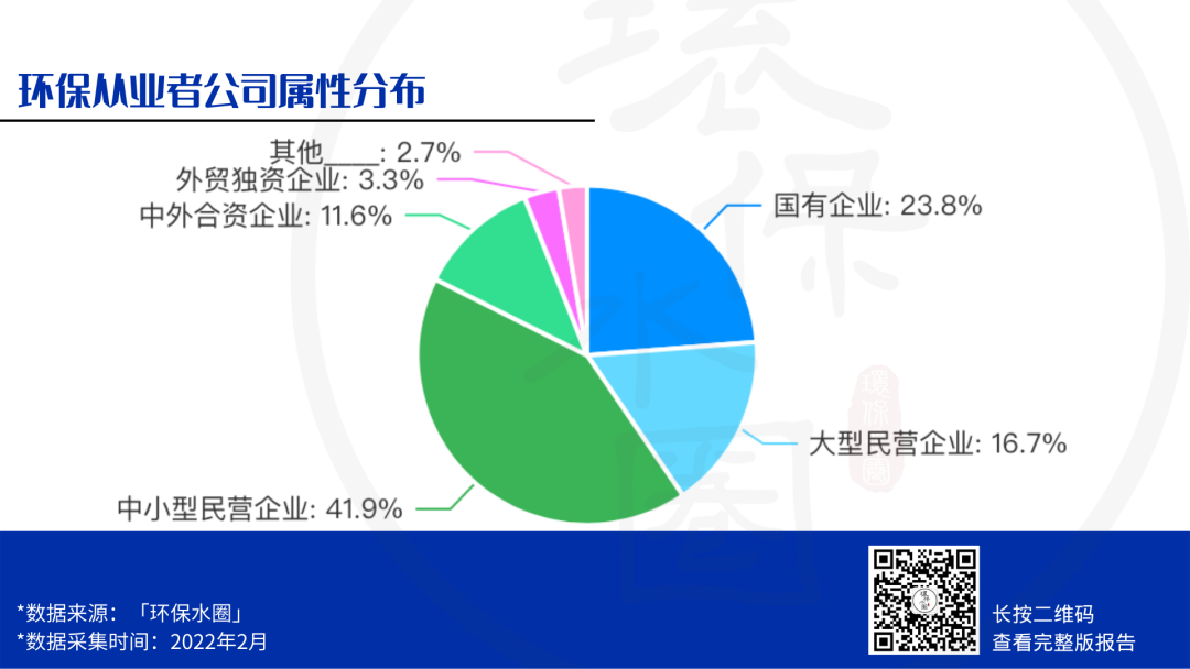 從數(shù)據(jù)中我們還可以看到,有23.8%的環(huán)保人工作在國(guó)企,有14.9%的環(huán)保人工作在中外合資或外商獨(dú)資的企業(yè)中,整體占比并不高。