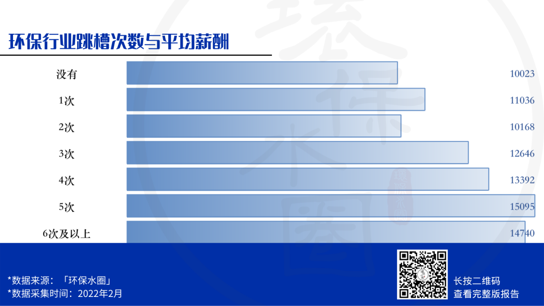 從調(diào)查結(jié)果中可以看到,跳槽經(jīng)歷在3-5次,環(huán)保人的平均薪酬都會(huì)有不同幅度的增加。但跳槽頻率不能與次數(shù)劃等號(hào),往往工作三年是一個(gè)分水嶺,高頻率的跳槽不僅對(duì)薪資增幅毫不幫助,還會(huì)影響個(gè)人能力的提升和經(jīng)驗(yàn)的積累。