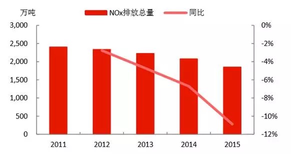 NOx的排放量為1852萬(wàn)噸,“十二五”剛開(kāi)始治理,當(dāng)前的下降速度還處于上升趨勢(shì),收關(guān)年2015年下降速度高達(dá)10.89%。
