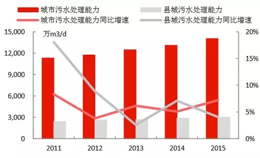 4)城市污水處理能力在2015年達(dá)到1.40億立方米/日,同比增長(zhǎng)7.19%;縣城達(dá)到2999萬(wàn)立方米/日,同比增長(zhǎng)了4.06%,城市和縣城的污水處理率分別達(dá)到91.9%和85.2%,較2010年分別提升了9.6和25.1個(gè)百分點(diǎn)。