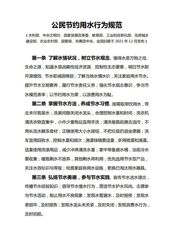 三是積極踐行水利部、中央文明辦等 10 部門聯(lián)合發(fā)布的《公民節(jié)約用水行 為規(guī)范》。用自己的文明言行勸導(dǎo)、糾正身邊的不良行為,形成節(jié)水的新常態(tài)。
