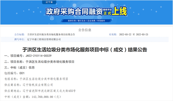 遼寧省政府采購(gòu)網(wǎng)消息,2022年3月22日,沈陽(yáng)市于洪區(qū)生活垃圾分類市場(chǎng)化服務(wù)項(xiàng)目公布開(kāi)標(biāo)結(jié)果,成交價(jià)1.4276億元。