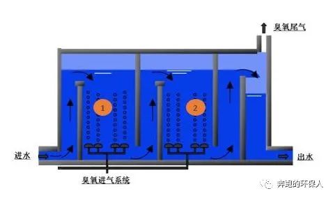臭氧消毒單元共有32座臭氧接觸池,每條處理線4座。每個接觸池分兩個反應(yīng)室,第一個反應(yīng)室寬8m、長8m,有效水深6.25m;第二個反應(yīng)室寬8m、長5.3m,有效水深6.25m。