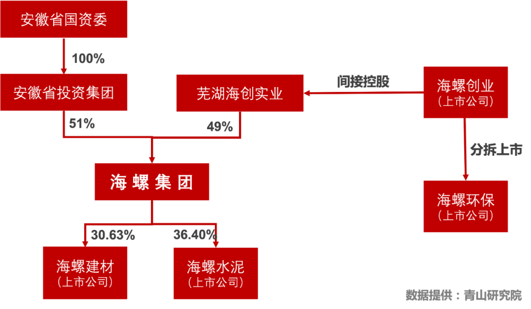 要想讀懂海螺環(huán)保,首先得搞懂隱在其身后的海螺帝國(guó),而要搞懂海螺帝國(guó),最好的方法就是厘清海螺系的主體海螺集團(tuán)和其中海螺環(huán)保、海螺創(chuàng)業(yè)、海螺水泥、海螺型材四家上市公司的關(guān)系,因?yàn)檫@其中蘊(yùn)藏著這個(gè)商業(yè)帝國(guó)的個(gè)性。海螺集團(tuán)是國(guó)務(wù)院120家大型試點(diǎn)企業(yè)集團(tuán),我國(guó)最大的建材企業(yè)集團(tuán)之一,世界500強(qiáng)企業(yè),是安徽省國(guó)企當(dāng)中首屈一指的龍頭,甚至一度被稱(chēng)為安徽的脊梁。其控股股東是安徽省國(guó)資委,間接持股51%,而另外的49%則是由本次分拆上市事件的主體海螺創(chuàng)業(yè)間接持有,是一家由國(guó)資控股的混合所有制企業(yè)。海螺集團(tuán)手握兩家上市公司,分別是聲名赫赫的海螺水泥和海螺型材。 海螺水泥: