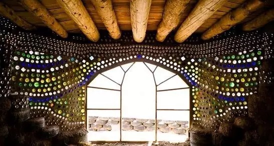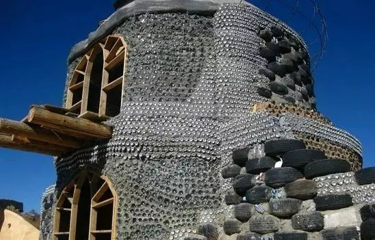 這是美國建筑師麥克·萊諾茲的作品。他的作品外形千奇百怪,而且都遵循著同一種理念:不需任何外接水電排污系統(tǒng),能夠自己發(fā)電,調溫,生產食物,收集循環(huán)用水;基本建材全是垃圾,廢棄輪胎、易拉罐、飲料瓶等。他給它們起了個名字:地球之舟Earthship。圖中的房子用輪胎和瓶子筑成的墻非常厚實,足以抵抗九級地震。