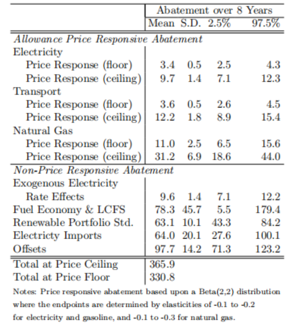 相對(duì)于價(jià)格因素而言,非市場(chǎng)因素對(duì)溫室氣體減排的貢獻(xiàn)較大。表1為2013-2020年減排供給量的估計(jì)值,該表下半部分的非市場(chǎng)因素,如清潔發(fā)電計(jì)劃、能效提升政策、清潔燃油政策等環(huán)境政策的減排量(Price Non-Responsive Abatement),明顯高于表上半部分的電力、燃油和天然氣等價(jià)格因素所產(chǎn)生的減排量(Allowance Price Responsive Abatement)。