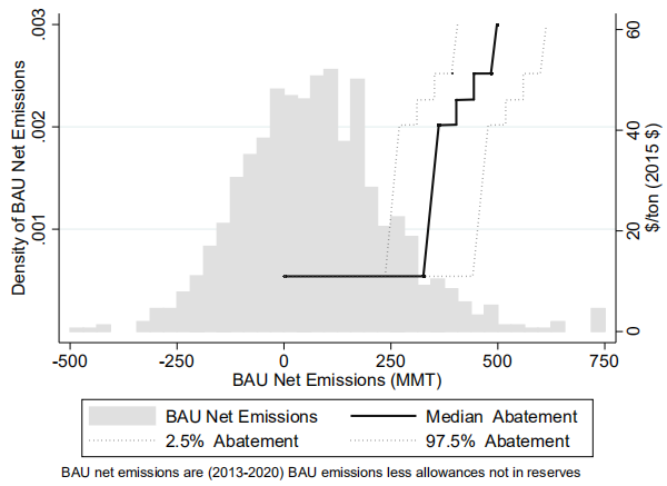 如圖2所示,通過(guò)分析減排需求和減排供給的估計(jì)值,文章發(fā)現(xiàn)市場(chǎng)出清時(shí),溫室氣體交易的價(jià)格有94.8%的概率處于或者接近價(jià)格下限即拍賣底價(jià)(Auction Reserve Price,ARP)。這意味著相對(duì)于估計(jì)得到的BAU排放量,排放配額的設(shè)定過(guò)高,此時(shí)經(jīng)濟(jì)主體通過(guò)非市場(chǎng)因素的配套政策即可完成溫室氣體減排約束,無(wú)需在交易市場(chǎng)上高價(jià)購(gòu)買(mǎi)排放配額。價(jià)格處于“內(nèi)部均衡”,即均衡價(jià)格高于價(jià)格下限ARP但低于價(jià)格上限(Allowance Price Containment Reserve,APCR)的概率為1.2%,此時(shí)溫室氣體排放的價(jià)格彈性較高,配額交易市場(chǎng)的減排有效性達(dá)到最優(yōu)狀態(tài)。