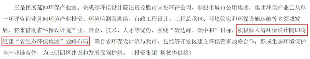 2021年8月,福建省三明市國資委網站發(fā)布文章《市投資集團:從三方面發(fā)力積極培育環(huán)保產業(yè)》中,其中提出要“積極融入省環(huán)保設計院即將組建‘省生態(tài)環(huán)保集團’戰(zhàn)略布局”。