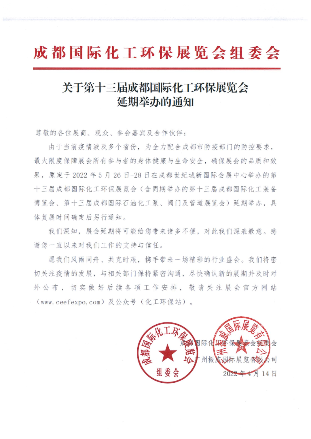 關(guān)于第十三屆成都國(guó)際化工環(huán)保展覽會(huì) 延期舉辦的通知