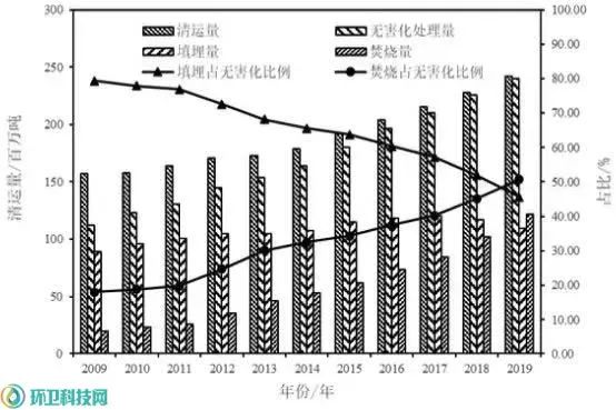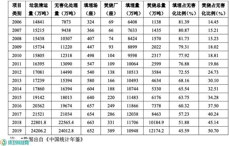 圖1 2009年至2019年城市生活垃圾不同無害化處置技術處置量及所占比例表1我國城市生活垃圾填埋發(fā)展趨勢與狀況(2006年~2019年)* 1.2填埋比例