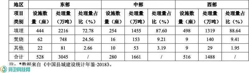 表2 2019年我國東、中、西部地區(qū)城市生活垃圾不同無害化處置技術對比* 2縣城生活垃圾填埋場