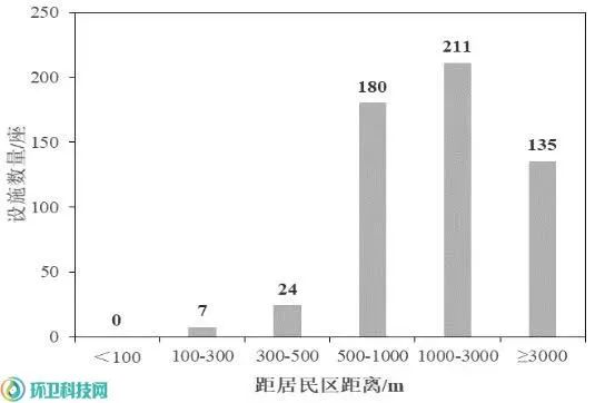 GB16889-2008規(guī)定:生活垃圾填埋場場址的位置及與周圍人群的距離應依據環(huán)境影響評價結論確定,并經地方環(huán)境保護行政主管部門批準。由圖3可知,2010~2015年新建填埋場中,填埋場場址距周邊居民區(qū)小于300米的有7座,300~500米的有24座,二者占有效數據(557座)的5.6%;500~1000米的有180座,占有效數據的32.5%;而距離大于3000米以上的填埋場僅135座,占有效數據的24.2%?,F場調研情況和統(tǒng)計分析結果表明:距居民區(qū)1000米內填埋場的惡臭投訴事件近90%,而距居民區(qū)大于3000米填埋場的惡臭投訴事件則幾乎沒有。