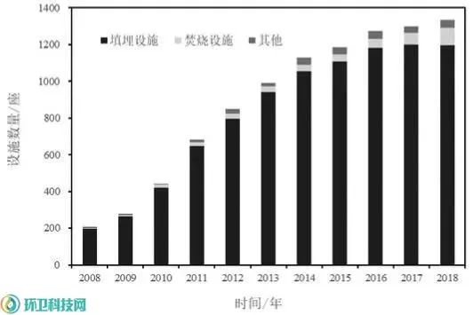 2018年全國縣級行政區(qū)域的無害化處理設施1324座,其中填埋設施1196座,2018年