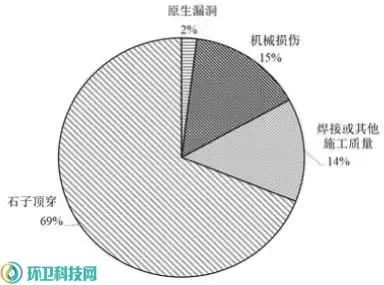 防滲層破損原因大致分為原生漏洞和次生漏洞兩種類型,其中次生漏洞又包括石子或樹根頂穿、機械損傷以及焊接問題三種類型。通過對漏洞檢測數據的統(tǒng)計分析,得出上述不同原因造成的HDPE膜破損的比例如圖4所示。