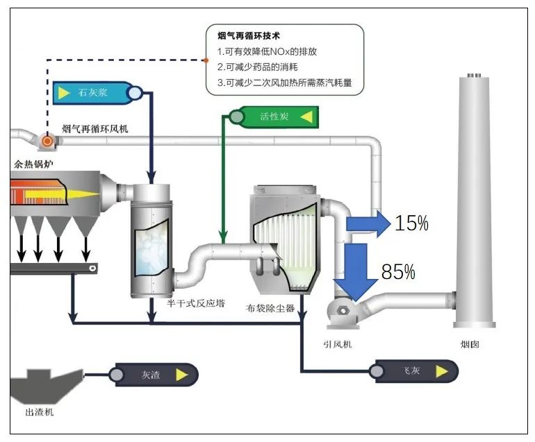 目前能夠滿足《生活垃圾污染控制標準》(GB18485-2014)和歐盟EU2010/75/EC排放標準的煙氣凈化處理工藝以“SNCR+半干法+干法+活性炭+袋式除塵”和“SNCR+半干法+干法+活性炭+袋式除塵+濕法”為主。但部分省市對NOx的排放標準提出了更高的要求,如DB37/2376-2013山東省區(qū)域性大氣污染物綜合排放標準的重點控制區(qū)域NOx限值為100mg/m3,垃圾焚燒煙氣NOx排放濃度限值低于100mg/m3成了一個趨勢。部分焚燒項目因此增加了SCR工藝以適應更高的環(huán)保要求。主流的脫硝技術(shù)包括焚燒爐燃燒控制爐溫、煙氣再循環(huán)技術(shù)、SNCR系統(tǒng)、SCR系統(tǒng)以及ICR(PNCR)系統(tǒng),其中焚燒爐燃燒控制爐溫與煙氣回流技術(shù)可有效降低原始NOx濃度。但通常采用焚燒爐燃燒控制爐溫、煙氣回流以及SNCR脫硝系統(tǒng)的情況下,NOx排放值仍無法穩(wěn)定控制在100mg/m3以內(nèi)。針對NOx排放限值為100mg/m3的垃圾焚燒項目,目前國內(nèi)垃圾焚燒發(fā)電廠采用的脫硝工藝有SNCR+SCR系統(tǒng)以及SNCR+ICR(PNCR)系統(tǒng)。從上海環(huán)境洛陽項目應用組合“煙氣再循環(huán)+SNCR+ICR(PNCR)”脫硝工藝后運行工況穩(wěn)定性較好,綜合成本更低。對于原先未采用煙氣再循環(huán)工藝的焚燒廠,如在引風機前增加煙氣再循環(huán)工藝,可有效降低引風機的電功率,利用再循環(huán)風替代原有二次風,可實現(xiàn)引風機的運行功率降低約10%。而且,應用煙氣再循環(huán)工藝后,爐內(nèi)過量空氣系數(shù)降低,焚燒爐出口NOx原始濃度可降低約30%-40%,穩(wěn)定控制在200mg/Nm3以內(nèi),入爐噸垃圾尿素消耗量可節(jié)約0.5kg左右,降低系統(tǒng)運行的能耗和藥劑消耗,實現(xiàn)碳減排。