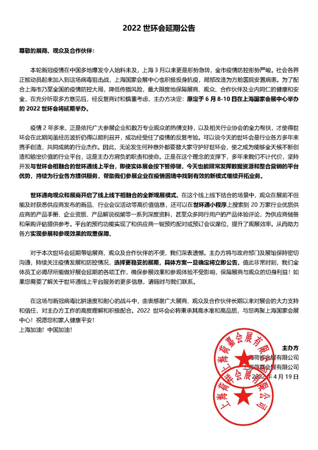 本輪新冠疫情在中國多地爆發(fā)令人始料未及,上海3月以來更是形勢急轉(zhuǎn),全市疫情防控形勢嚴(yán)峻。社會各界正被動員起來加入到這場病毒狙擊戰(zhàn),上海國家會展中心也積極投身抗疫,局部改造為方艙醫(yī)院安置病患。為了配合上海市乃至全國的疫情防控大局,降低傳播風(fēng)險(xiǎn),最大限度地保障展商、觀眾、合作伙伴及業(yè)內(nèi)同仁的健康和安全,在充分聽取多方意見后,經(jīng)反復(fù)商討和慎重考慮,主辦方?jīng)Q定:原定于6月8-10日在上海國家會展中心舉辦的2022世環(huán)會將延期舉辦。