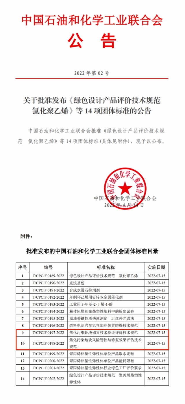 2022年4月14日,中國石油和化學工業(yè)聯(lián)合會發(fā)布公告2022年第02號,正式批準《焦化污染地塊修復(fù)技術(shù)驗證評價技術(shù)規(guī)范(T/CPCIF 0197-2022)》《焦化污染地塊風險管控與修復(fù)效果評估技術(shù)規(guī)范(T/CPCIF 0198-2022)》兩項團體標準發(fā)布實施。