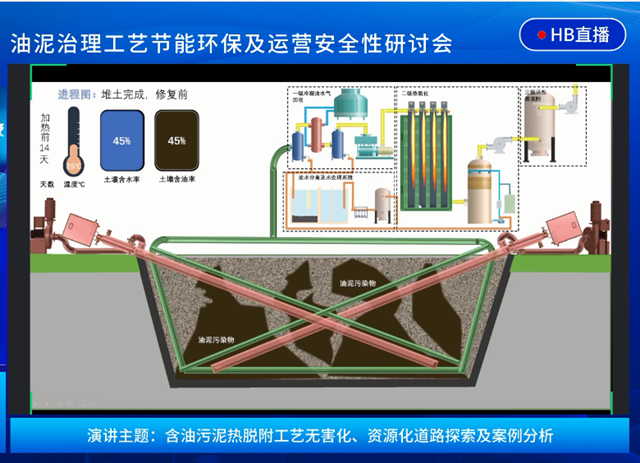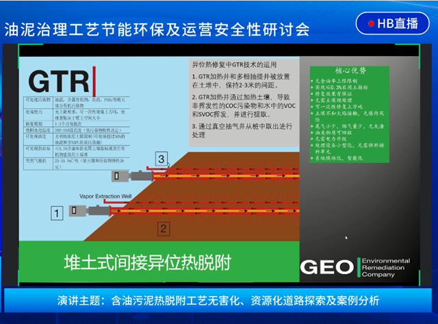 本次研討會上陳曉松博士也帶來了《含油污泥熱脫附工藝無害化、資源化道路探索及案例分析》的分享。陳博士重點(diǎn)介紹了GEO公司的堆土間接熱脫附技術(shù),堆土間接熱脫附技術(shù)也是原位脫附技術(shù)的翻版,核心技術(shù)原理上是一致的。堆土間接熱脫附技術(shù)首先會將污染土堆成一個(gè)土堆,在外圍圍上隔熱板,然后插入加熱井和抽提井,加熱井連接燃燒器及空氣,抽提井連接地表尾氣處理設(shè)備。