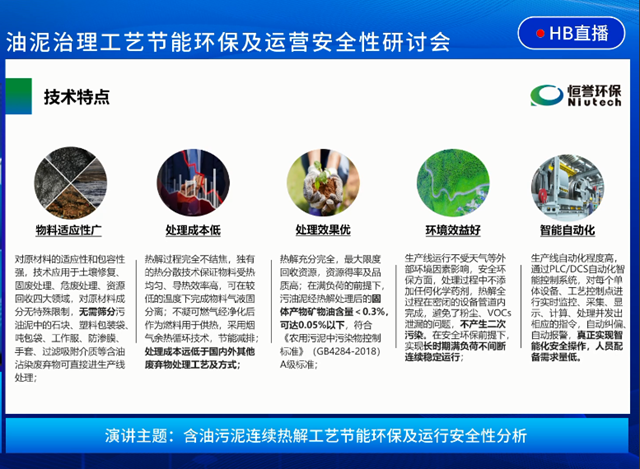 恒譽(yù)環(huán)保高級工程師童蘭英在《含油污泥連續(xù)熱解工藝節(jié)能環(huán)保及運(yùn)行安全性分析》的主題演講中強(qiáng)調(diào),熱解工藝及設(shè)備只有在滿足供熱溫度、熱傳導(dǎo)效率、導(dǎo)熱面積、停留時(shí)間、工作壓力、防聚合工藝六大關(guān)鍵要素實(shí)現(xiàn)有機(jī)匹配,才能實(shí)現(xiàn)工藝設(shè)備安全、環(huán)保、節(jié)能低耗。為此,恒譽(yù)環(huán)保對應(yīng)開發(fā)了無結(jié)焦技術(shù)、熱氣密技術(shù)、防聚合技術(shù)、熱解關(guān)鍵要素最優(yōu)匹配技術(shù)、低溫?zé)峤饧夹g(shù)、組合式煙氣凈化技術(shù)、全密封技術(shù)、專有控制技術(shù)八大核心技術(shù)。恒譽(yù)環(huán)保連續(xù)熱解工藝在物料適應(yīng)性、經(jīng)濟(jì)性、處理效果、環(huán)境效益以及智能自動化方面都取得良好的表現(xiàn),并成功應(yīng)用于國內(nèi)外多個(gè)項(xiàng)目。