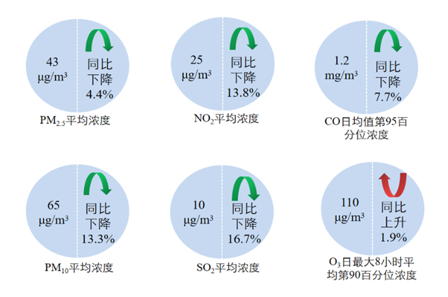 1—3月,全國339個地級及以上城市平均優(yōu)良天數(shù)比例為83.8%,同比上升2.9個百分點(diǎn);PM2.5平均濃度為43微克/立方米,同比下降4.4%;PM10平均濃度為65微克/立方米,同比下降13.3%;O3平均濃度為110微克/立方米,同比上升1.9%;SO2平均濃度為10微克/立方米,同比下降16.7%;NO2平均濃度為25微克/立方米,同比下降13.8%;CO平均濃度為1.2毫克/立方米,同比下降7.7%。