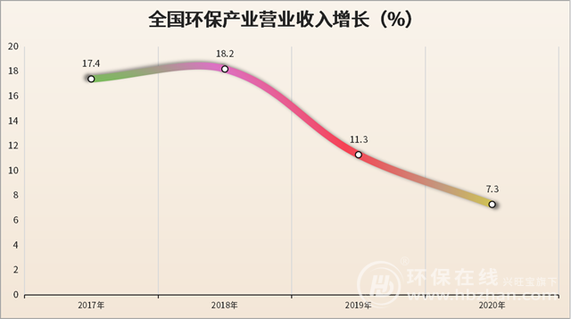 并且不可否認的是,隨著“十三五”規(guī)劃目標的圓滿完成,環(huán)保產(chǎn)業(yè)規(guī)模的增速確有波動。來自中國環(huán)保產(chǎn)業(yè)協(xié)會的《中國環(huán)保產(chǎn)業(yè)發(fā)展狀況報告(2021)》顯示,2020年全國環(huán)保產(chǎn)業(yè)營業(yè)收入增長約為7.3%??梢詫Ρ纫幌拢鏊俜啪彽男盘栠€是比較明顯的。