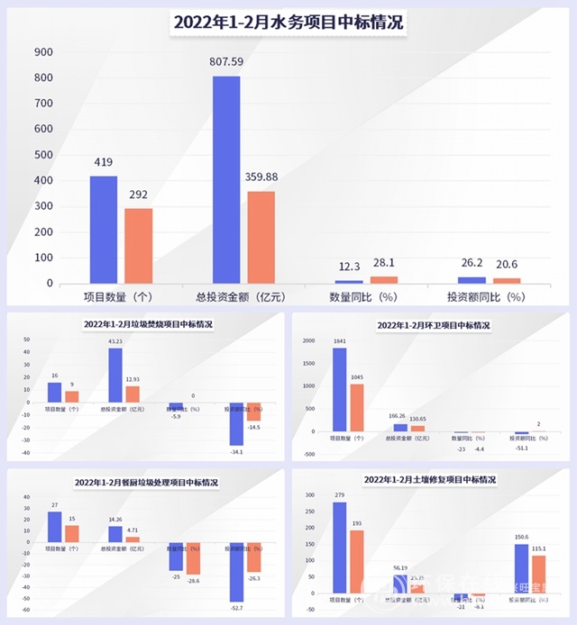 從上述圖表來看,2022年前兩個月,環(huán)衛(wèi)中標項目最多,水務中標金額最大,餐廚垃圾的同比下滑最多,土壤修復2個月的投資額同比增幅均超過了110%,1月更是達到了150.6%,而同時中標數(shù)量卻是下降的,堪稱“完美逆襲”。