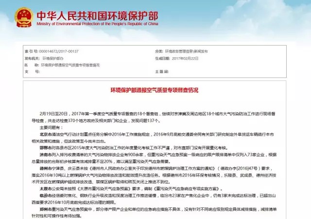 2月19日至20日,2017年第一季度空氣質(zhì)量專項(xiàng)督查的18個(gè)督查組,繼續(xù)對(duì)京津冀及周邊地區(qū)18個(gè)城市大氣污染防治工作進(jìn)行現(xiàn)場(chǎng)督導(dǎo)檢查,共走訪檢查370個(gè)地方政府及相關(guān)部門和企業(yè),發(fā)現(xiàn)問(wèn)題137個(gè)。