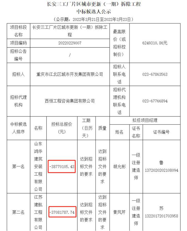 這個(gè)奇葩的案例,就是不久前發(fā)布中標(biāo)公告的重慶市長安三工廠片區(qū)城市更新(一期)拆除工程項(xiàng)目。中標(biāo)人為山東鴻華建筑安裝工程有限公司(私企),中標(biāo)金額約為“-3877.01萬元”。更有意思的是,第二中標(biāo)人和第三中標(biāo)人的報(bào)價(jià)分別為-3708.18萬元和-3517.51萬元,也均為負(fù)數(shù)。