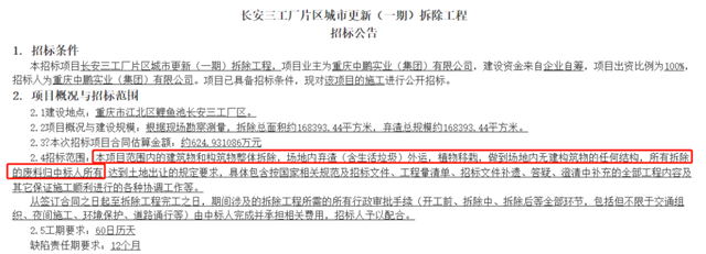 2022年2月23日,重慶中鵬實(shí)業(yè)(集團(tuán))有限公司發(fā)布了長安三工廠片區(qū)城市更新(一期)拆除工程的招標(biāo)公告。招標(biāo)公告稱,拆除總面積約168393.44平方米,棄渣總規(guī)模約168393.44平方米,合同金額約為約624.931086萬元。