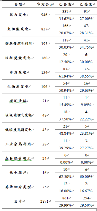 CCER審批2013年啟動,當年提交審定的51個項目中,已有36個完成減排量簽發(fā)。2017年提交審定的164個項目則全部處于審定公示狀態(tài)。而從備案來看,2014年完成審定并提交備案申請的項目共有140個,139個成功獲得備案,其中的100個獲得減排量簽發(fā)。