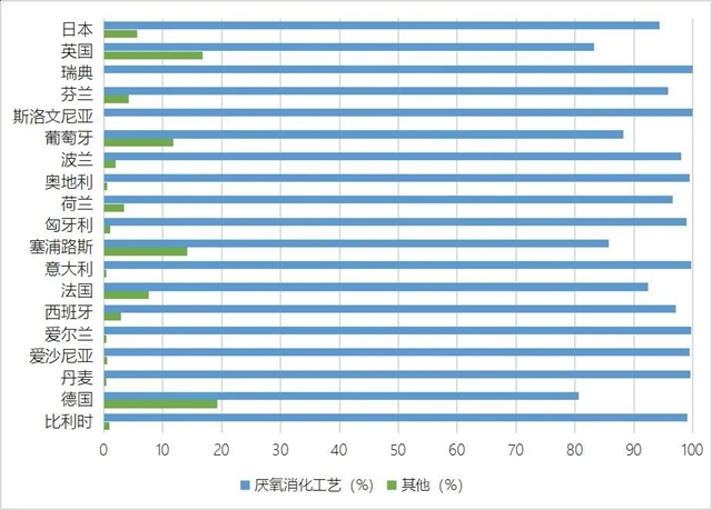 由圖1可以看出,目前發(fā)達國家的廚余垃圾處理技術(shù)主要以厭氧消化為主,約占市場份額的9成左右。其主要原因是相比于堆肥等其他處理技術(shù),厭氧消化技術(shù)更加環(huán)保和先進,受到業(yè)內(nèi)的廣泛關(guān)注,逐步形成一套成熟的產(chǎn)業(yè)鏈,進而得到市場的認可和推廣。