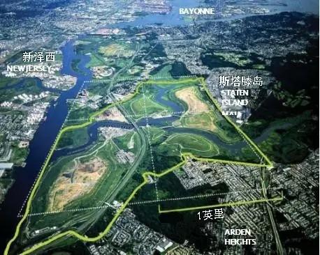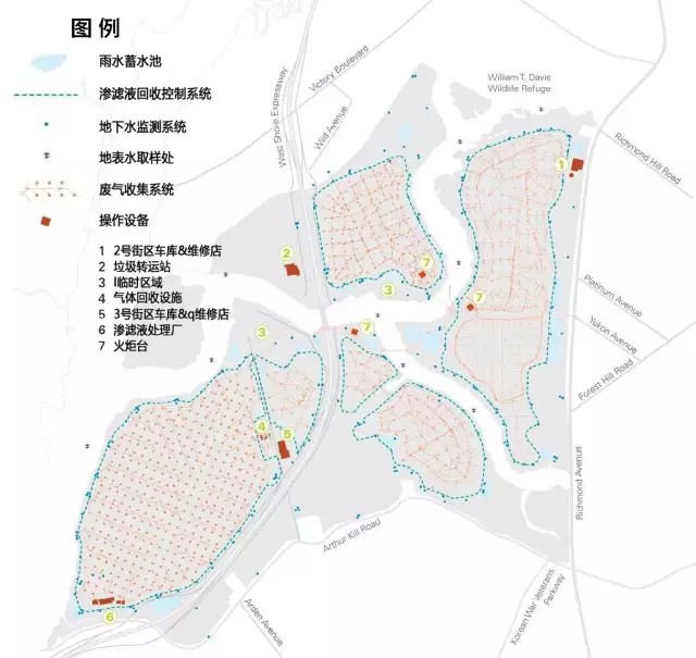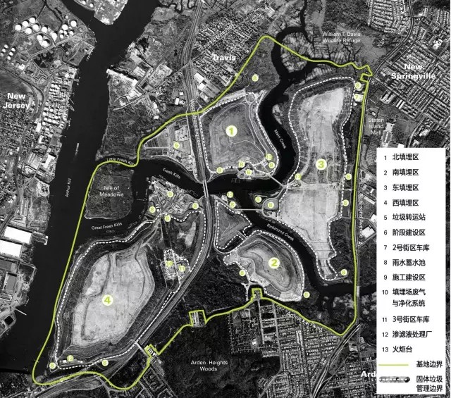 弗萊士河垃圾填埋場位于紐約斯塔滕島(圖3),占地面積超過2200英畝(約8.9k㎡),于1948年投入運(yùn)營,2001年停止接收垃圾。這里曾經(jīng)是世界上最大的垃圾填埋場,也是1990年代紐約市唯一仍在使用的填埋場。隨著1999年弗萊士河更新計(jì)劃的啟動,原有填埋場區(qū)陸續(xù)關(guān)閉并封場,直至2001年,填埋場接收了最后一批垃圾——“9?11”事件的世貿(mào)中心建筑廢墟。