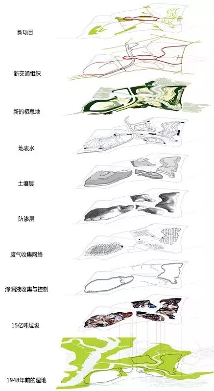 環(huán)境修復(fù)與垃圾防滲是弗萊士河公園改造初期的關(guān)鍵任務(wù),其中運(yùn)用了多層覆蓋技術(shù),收集廢棄物產(chǎn)生的氣體、滲漏液的系統(tǒng)和水質(zhì)檢測系統(tǒng)(圖7,圖8)。場地生態(tài)修復(fù)需達(dá)到嚴(yán)格的標(biāo)準(zhǔn)后方允許啟動各類建設(shè)項(xiàng)目。