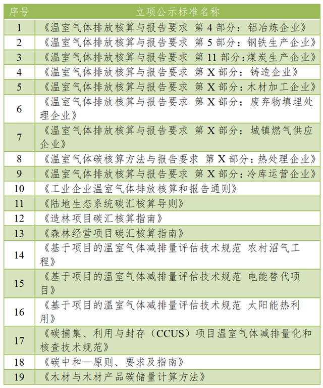 國家市場監(jiān)督管理總局對《溫室氣體排放核算與報告要求 第4部分:鋁冶煉企業(yè)》等10項溫室氣體碳核算標準,《陸地生態(tài)系統(tǒng)碳匯核算導(dǎo)則》等3項碳匯核算標準,《基于項目的溫室氣體減排量評估技術(shù)規(guī)范 農(nóng)村沼氣工程》等4項碳減排標準,以及《碳中和—原則、要求及指南》《木材與木材產(chǎn)品碳儲量計算方法》等標準進行立項公示。具體見下表。