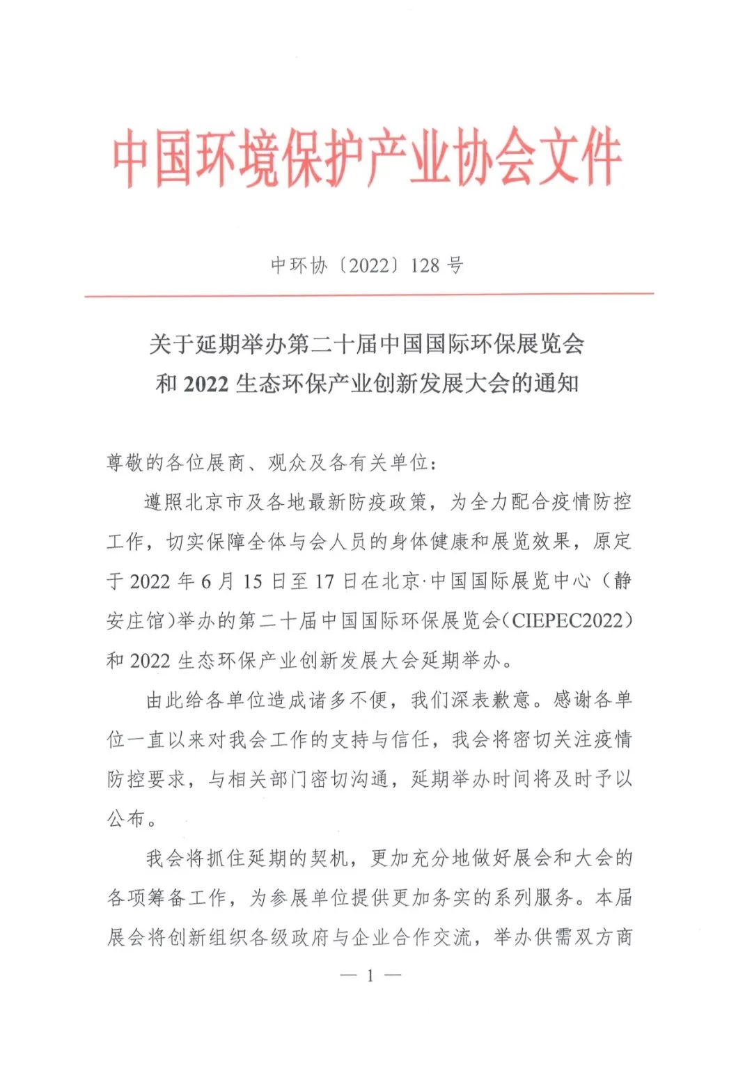 遵照北京市及各地最新防疫政策,為全力配合疫情防控工作,切實保障全體與會人員的身體健康和展覽效果,原定于2022年6月15日至17日在北京·中國國際展覽中心(靜安莊館)舉辦的第二十屆中國國際環(huán)保展覽會(CIEPEC2022)和2022生態(tài)環(huán)保產(chǎn)業(yè)創(chuàng)新發(fā)展大會延期舉辦。