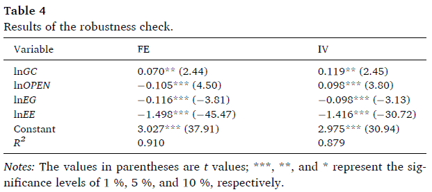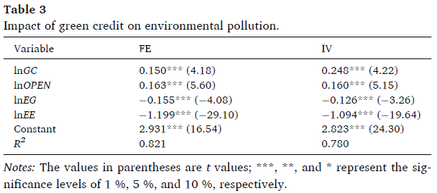 為了緩解模型中存在的由變量缺失或綠色信貸測量誤差引起的內(nèi)生問題,本研究采用綠色信貸的一階滯后項作為工具變量。表3中報告的工具變量法(IV)產(chǎn)生的估計結(jié)果與固定效應(yīng)模型基本一致。控制變量的系數(shù)和顯著性水平也與之前的結(jié)果一致。